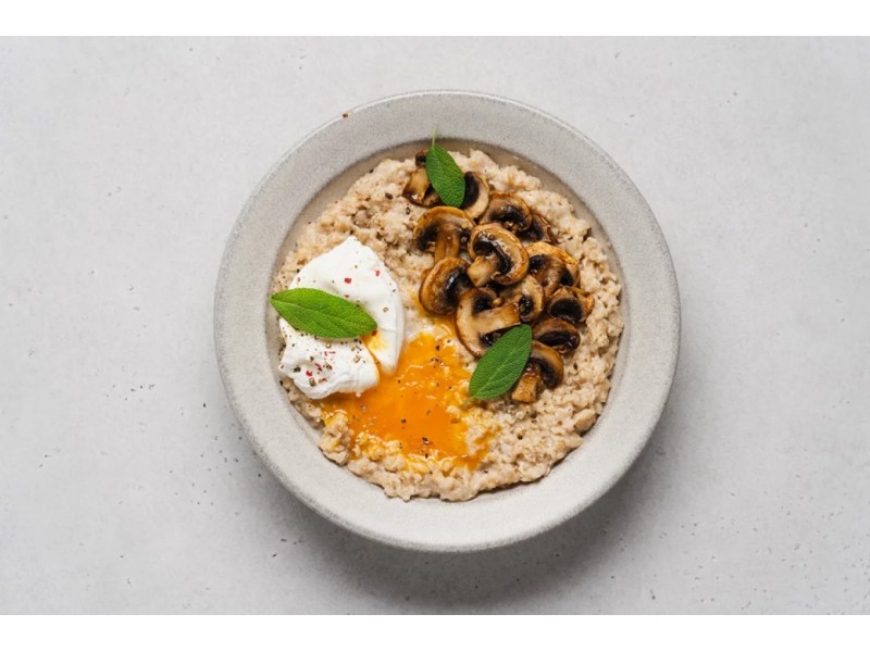 5.Добавьте обжаренные грибы, яйцо пашот и зелень, по желанию.